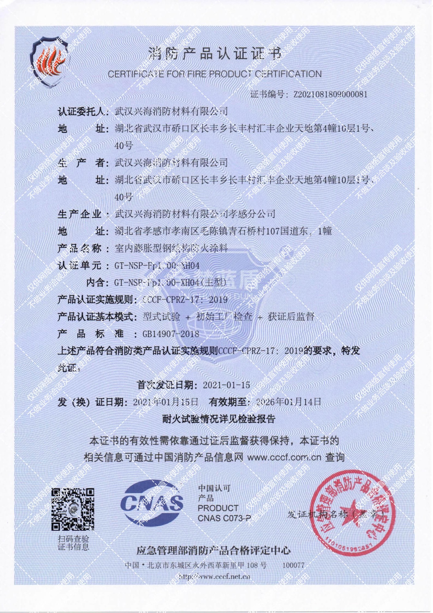 室內(nèi)膨脹型(水基型)1小時鋼結構防火涂料消防產(chǎn)品認證證書